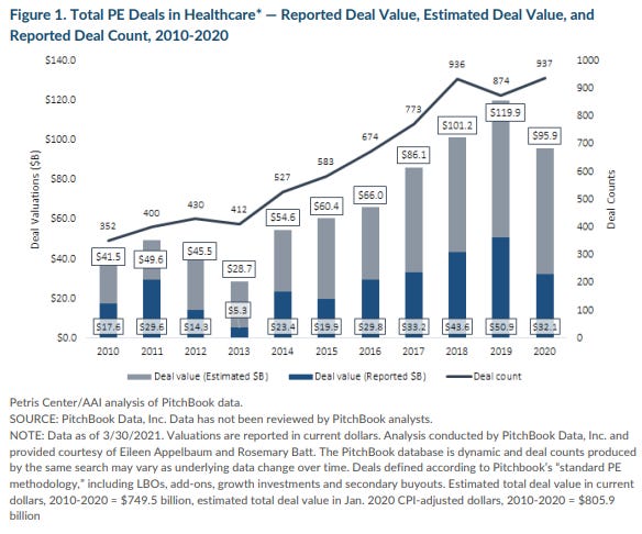 As you’d expect, investors and shareholders would like returns. The market’s going to reward certain holdings more than others. Reality shows us that buying hospitals and certain clinics pays well. UC Berkeley and the American Antitrust Institute wrote a paper covering private equity (PE) healthcare acquisition trends. The authors noted that $41.5B of 352 deals in 2010 grew about 2.3x to $95.9B of 937 deals in 2020. The share of healthcare buyouts in reported private equity transactions overall grew from 12% in 2010 to 18% in 2020 (a 41% increase). Those numbers wouldn’t behave that way if those purchases weren’t profitable. Here’s the play that private equity companies run. Buy some large or many small healthcare facilities with mostly debt financing, consolidate the clinics’ operations under one umbrella, raise earnings though billing and referrals etc., cut costs from unnecessary staff, and sell the whole portfolio with a higher multiple driven by those aforementioned factors. The incentives to pump up returns and improve care for patients clash among multiple areas. Drawing a map to pinpoint all the involved characters is helpful but unnecessary for now. I’ll link UC Berkeley’s more detailed analysis on my page at rushinagalla.susbtack.com. The conflicts start with the purpose of each party.
